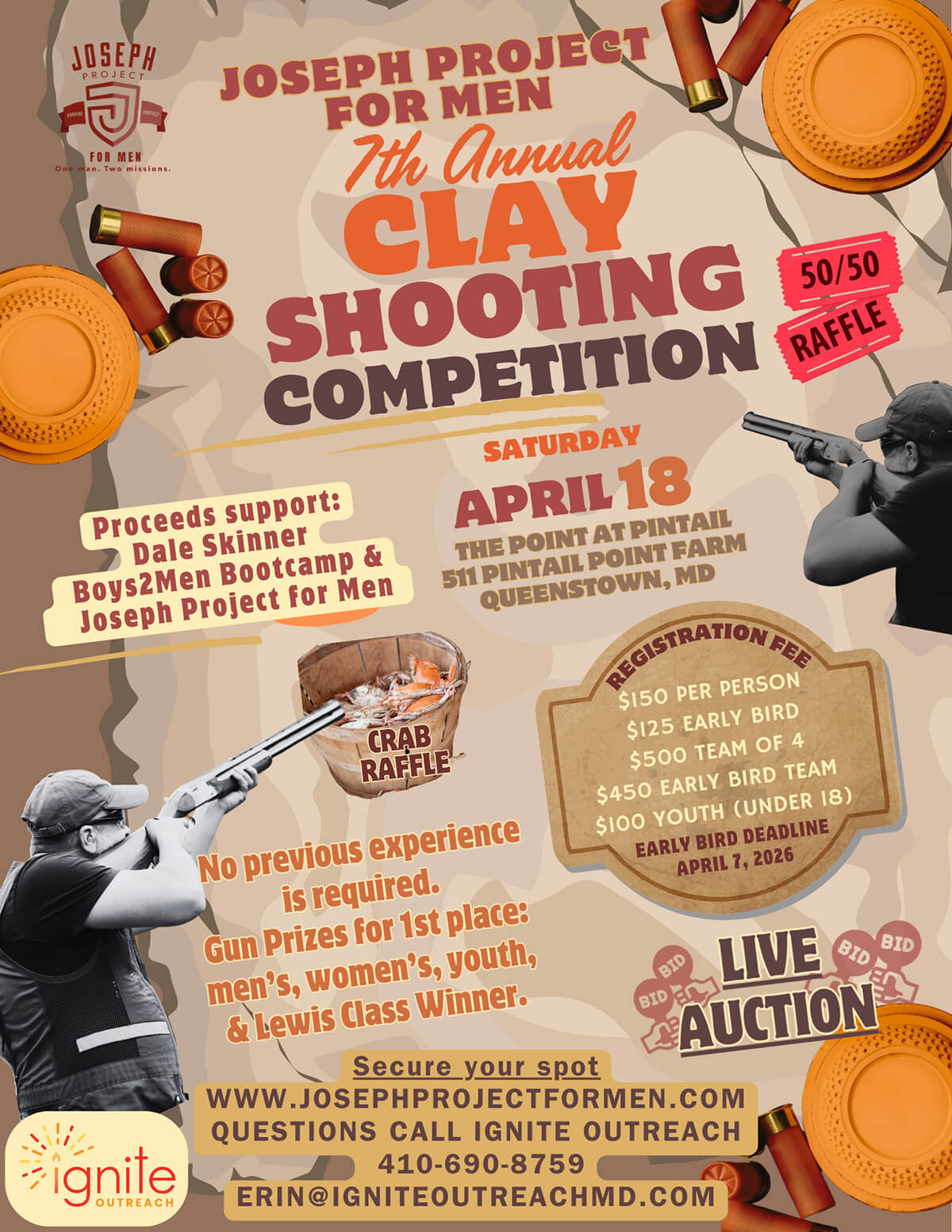 Dale Skinner Boys 2 Men Clay Shoot Fundraiser April 18, 2026 8:00 AM Registration Meeting 9:00 AM Safety Meeting Pintail Point in Queenstown All proceeds from this event benefit the Boys 2 Men Boot Camp Invitation Letter PDF Registration Form Sponsorship Opportunities Online Registration Clay Shoot Registration Company Name Individual Name * Gender Male Female Address Address Address Address City City State/Province AlabamaAlaskaArkansasArizonaCaliforniaColoradoConnecticutDelawareDistrict of ColumbiaFloridaGeorgiaHawaiiIdahoIllinoisIndianaIowaKansasKentuckyLouisianaMaineMarylandMassachusettsMichiganMinnesotaMississippiMissouriMontanaNebraskaNevadaNew HampshireNew JerseyNew MexicoNew YorkNorth CarolinaNorth DakotaOhioOklahomaOregonPennsylvaniaRhode IslandSouth CarolinaSouth DakotaTennesseeTexasUtahVermontVirginiaWashingtonWest VirginiaWisconsinWyoming State/Province Zip/Postal Zip/Postal Phone Email * Participation Participation Options Individual Shooter - $150 Team of 4 Shooters - $500 Junior Shooter (16 & Under) - $100 Non-participant lunch - $15 Participation Options Individual Shooter - $125 Team of 4 Shooters - $450 Junior Shooter (16 & Under) - $95 Non-participant lunch - $15 (Currently showing Early Bird Pricing for registration prior to April 7) Sponsorships Sponsorship Options Tournament Sponsors - $10,000 Sure Shot Sponsor - $5,000 High Flyer Sponsor - $2,500 Pro Sponsor - $1,000 Course Sponsor - $500 Station Sponsor - $150 Additional item: Golf cart rental, reserve with Pintail - Call 410.827.7065 Total After submitting this registration form, you will be shown a link to the donation form where you can make an online payment for the amount above. Submit If you are human, leave this field blank.